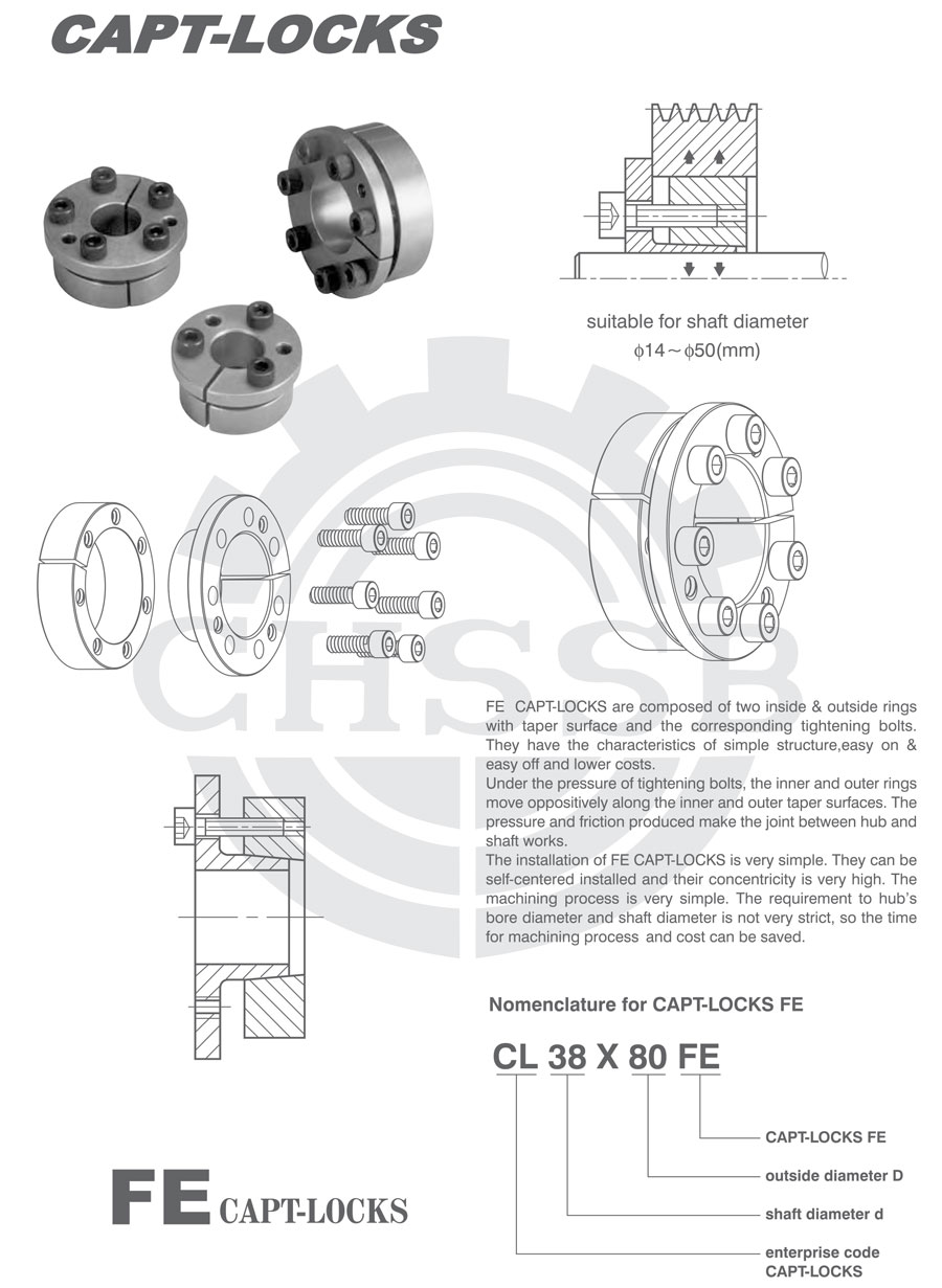 FE型脹緊聯(lián)結(jié)套由兩個帶錐面的內(nèi)外環(huán)和相應(yīng)壓緊螺釘組成,具有結(jié)構(gòu)簡單,拆卸方便,低成本等特點。在壓