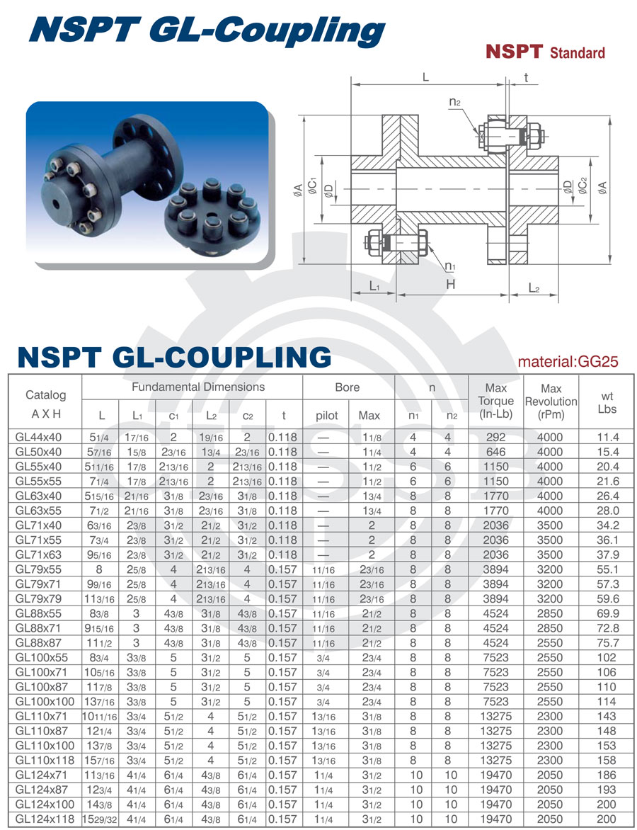 產(chǎn)品范圍: 美標(biāo)/歐標(biāo):(GL44-GL124) 英制尺寸產(chǎn)品(適用于美標(biāo)市場(chǎng)) 公制尺寸產(chǎn)品(適用于歐標(biāo)市場(chǎng)) GL型聯(lián)軸器