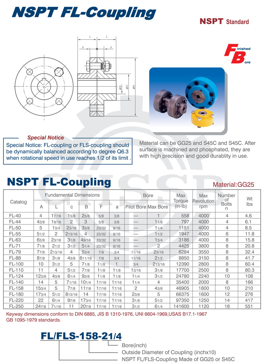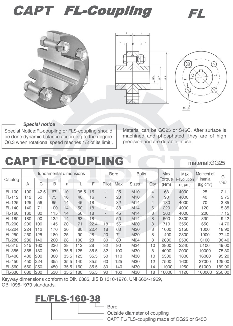 產品范圍: 美標:(FL/FLS) 歐標:(FL/FLS) 英制尺寸產品(適用于美標市場) 公制尺寸產品(適用于歐標市場) FL型聯軸器 FLS型聯軸器